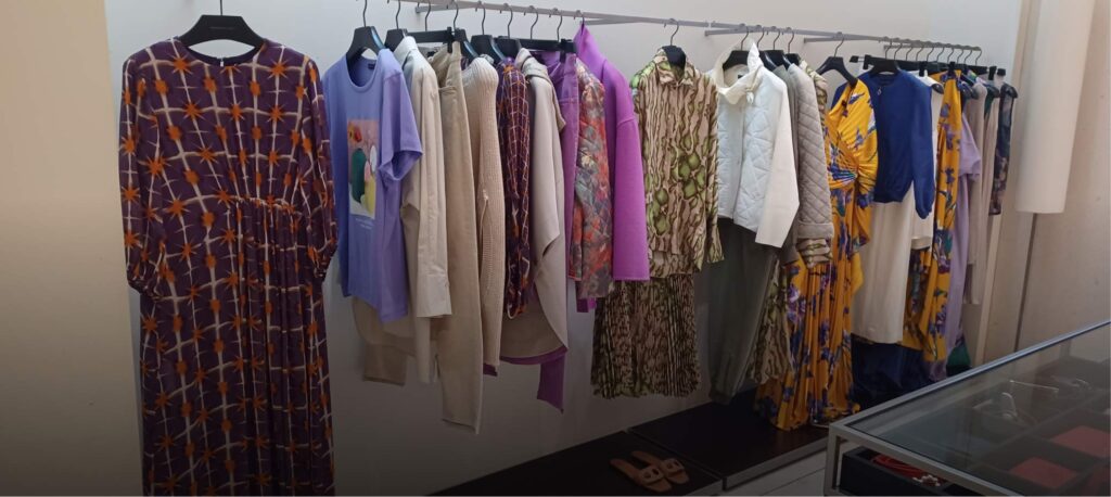 Bolsos y prendas de vestir de diseño propio para hombre y mujer en elegantes tiendas de moda y complementos.